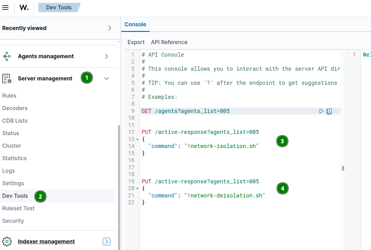 Navigate to the Dev tools of Server management to run/test the network isolation/de-isolation actions: